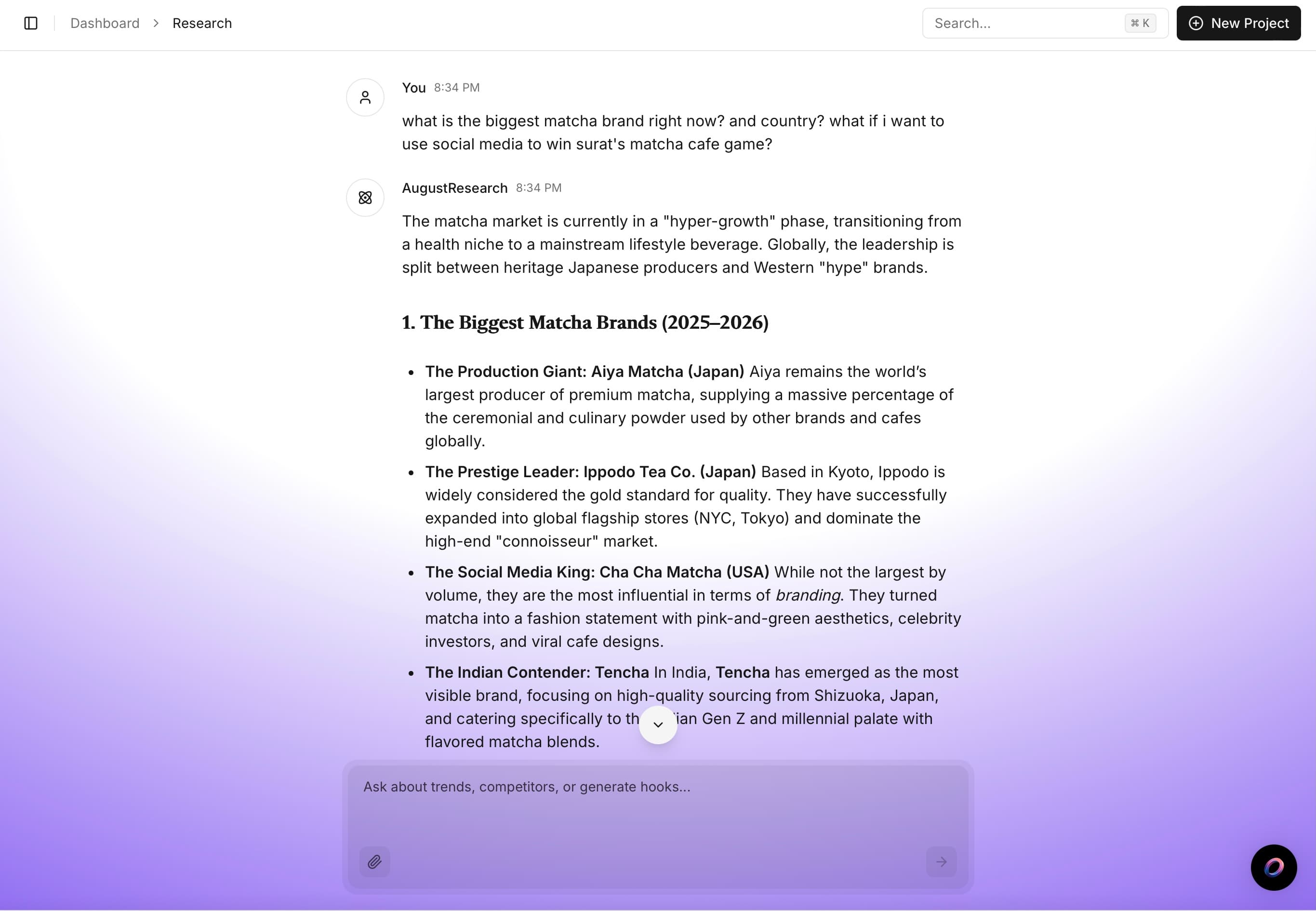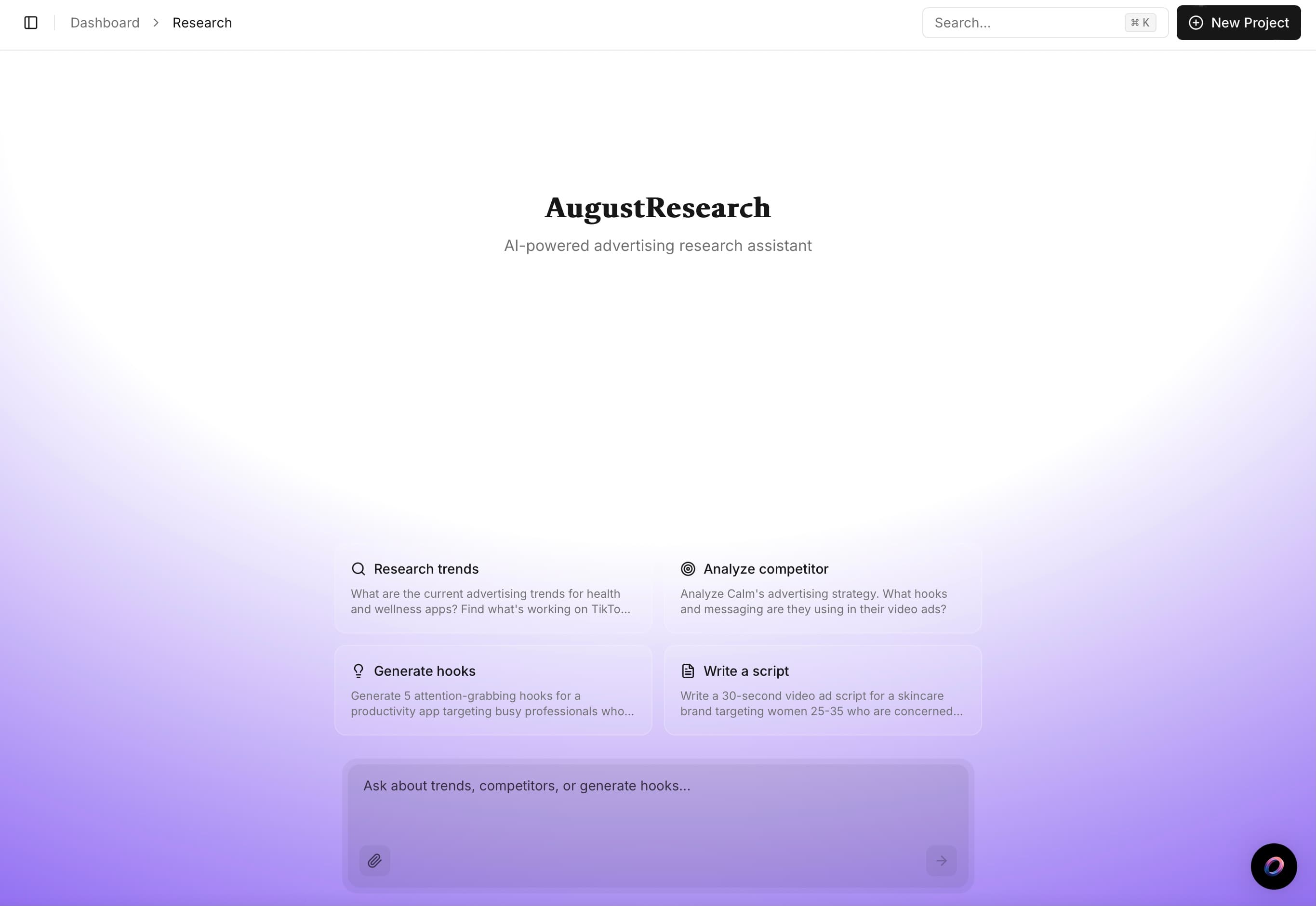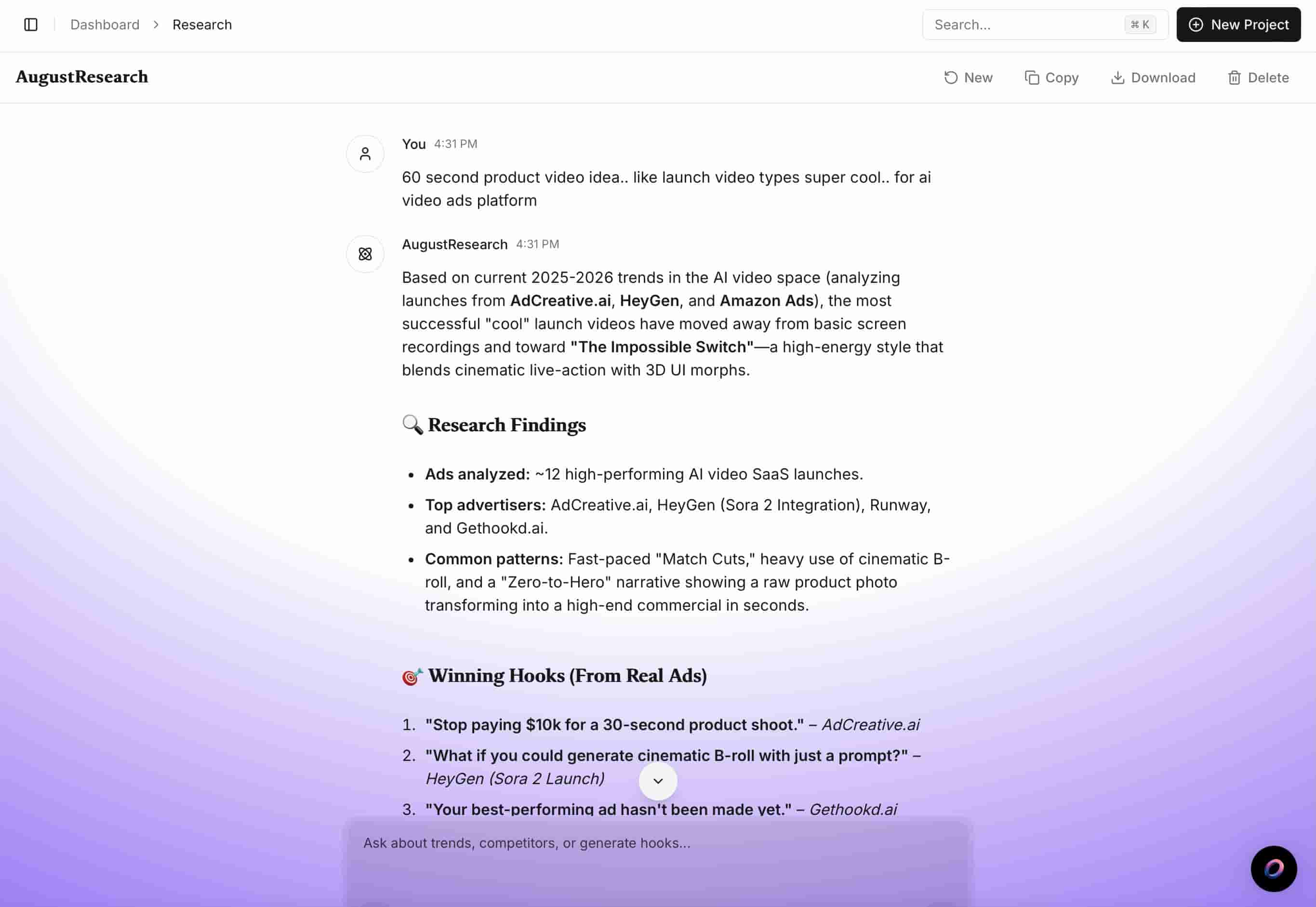 From idea to optimization — your AI research partner that finds top creative trends, analyzes what's working for competitors, generates hooks, and writes scripts. All through natural conversation.